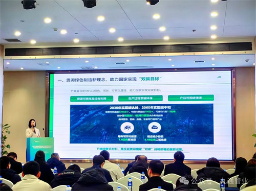 九通集團副總經(jīng)理、國科產(chǎn)融(北京)科學(xué)技術(shù)研究院院長羅珍受邀學(xué)術(shù)交流環(huán)節(jié)作“以竹代塑”“以竹代鋼”“以竹代砼”——劃時代的材料變革》的主旨報告。她通過竹基復(fù)合新材料的綠色、低碳、可再生屬性及技術(shù)特性、工程應(yīng)用等方面向大家分享了材料革新在工程應(yīng)用中的巨大作用和意義。