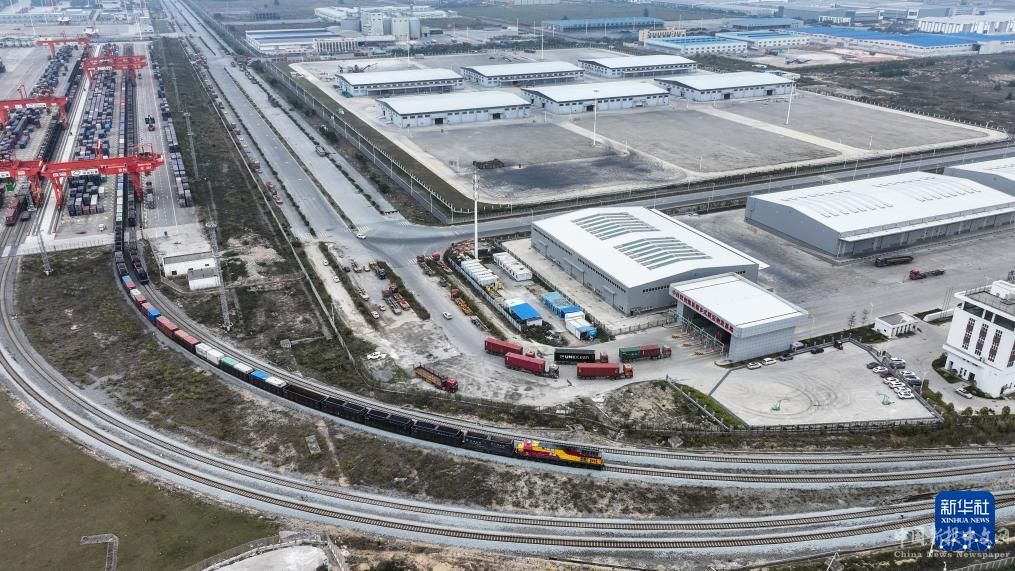 火車在廣西欽州鐵路集裝箱中心站裝運集裝箱(3月1日攝,無人機(jī)照片)。