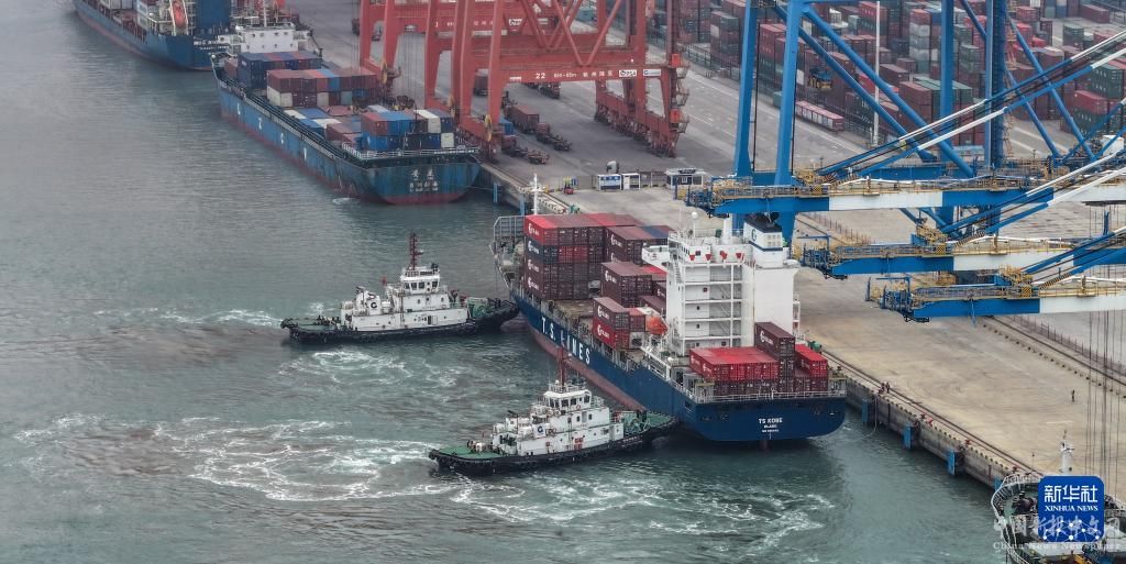 在廣西欽州港碼頭,海事船在助推海輪靠岸卸貨(3月1日攝,無人機(jī)照片)。