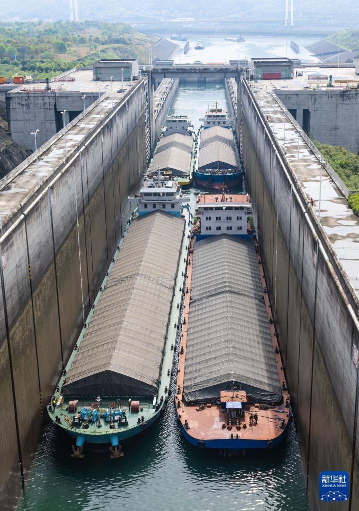 4月6日,船舶有序通過三峽雙線五級船閘(無人機(jī)照片)。