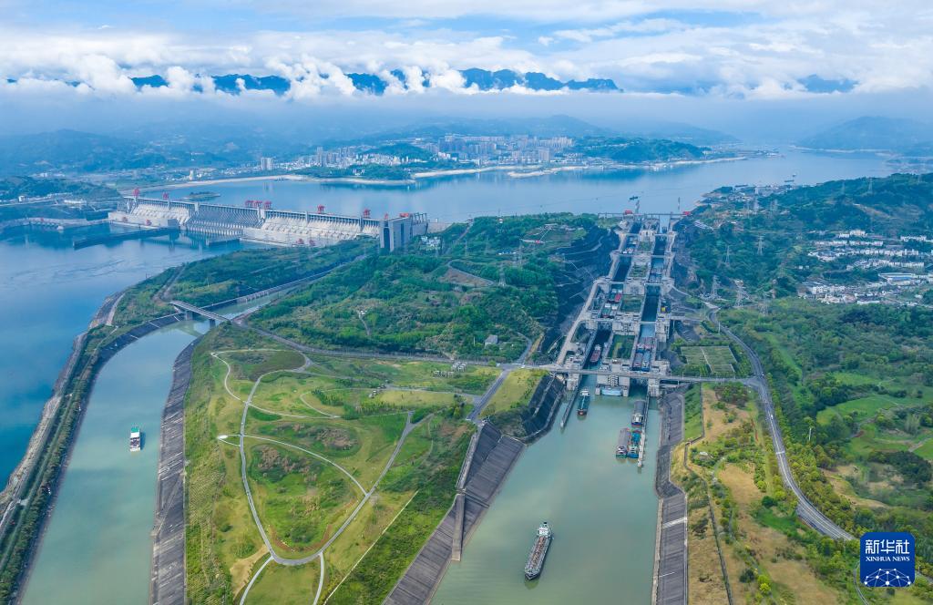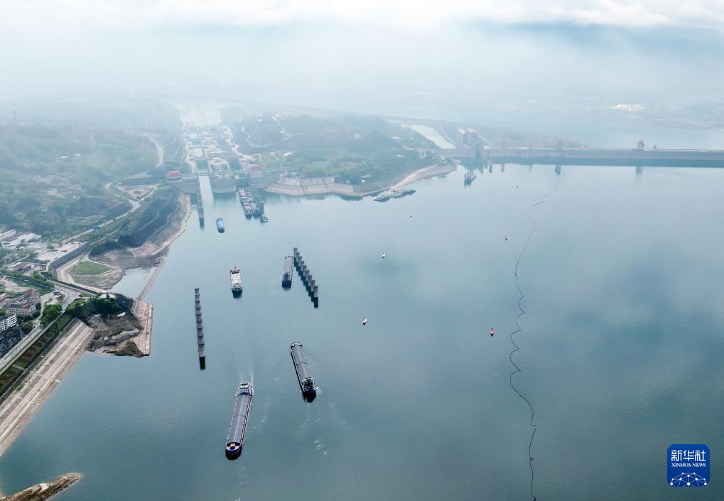 4月6日,船舶通過三峽北線船閘后行駛在三峽大壩附近的湖北省宜昌市夷陵區(qū)太平溪水域(無人機(jī)照片)。