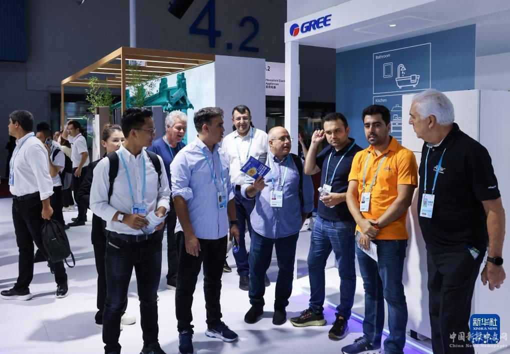 境外采購商在第135屆廣交會(huì)智慧生活展區(qū)格力展位前了解中國(guó)出口的智能家電(4月15日攝)。