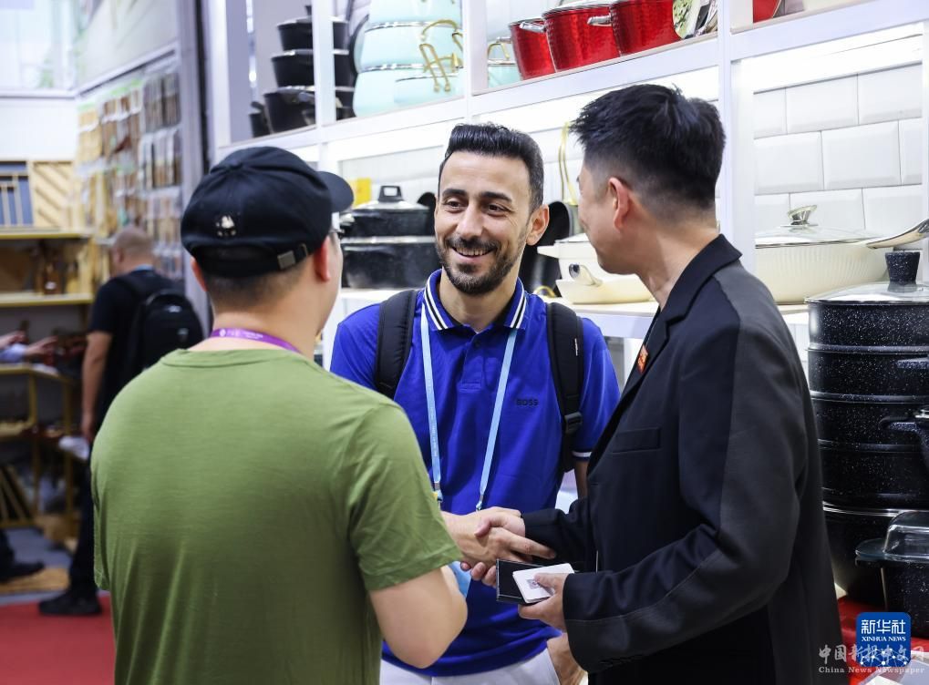 來自土耳其的采購商(中)在第135屆廣交會(huì)上洽談(4月24日攝)。