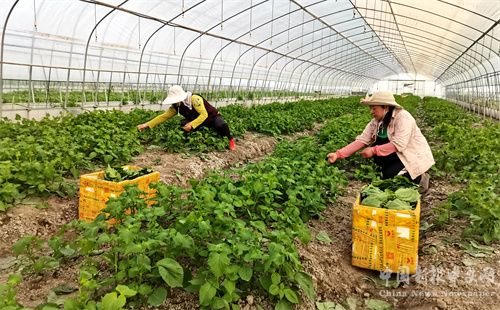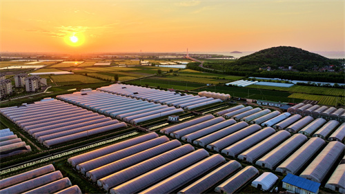5月2日,安徽省合肥市廬江縣白山鎮(zhèn)同春村騰云生態(tài)農(nóng)業(yè)家庭農(nóng)場,一輪夕陽將連棟大棚映照得格外美麗,工人正在大棚里采收可追溯特種蔬菜紫蘇。
