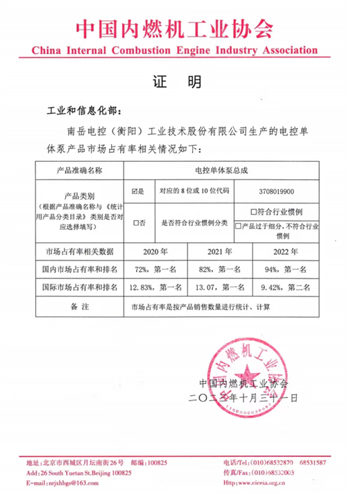 中國(guó)內(nèi)燃機(jī)工業(yè)協(xié)會(huì)出具證明顯示,南岳電控生產(chǎn)的電控單體泵總成2020年、2021年、2022年在國(guó)內(nèi)市場(chǎng)分別占比72%、82%、94%,三年均位居全國(guó)第一;2020年在國(guó)際市場(chǎng)占比12.83%,位居全球第一;2021年在國(guó)際市場(chǎng)占比13.07%,蟬聯(lián)第一;2022年在國(guó)際市場(chǎng)占比9.42%,位居全球第二。