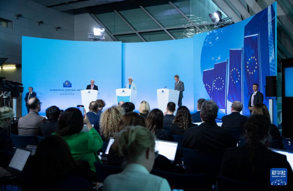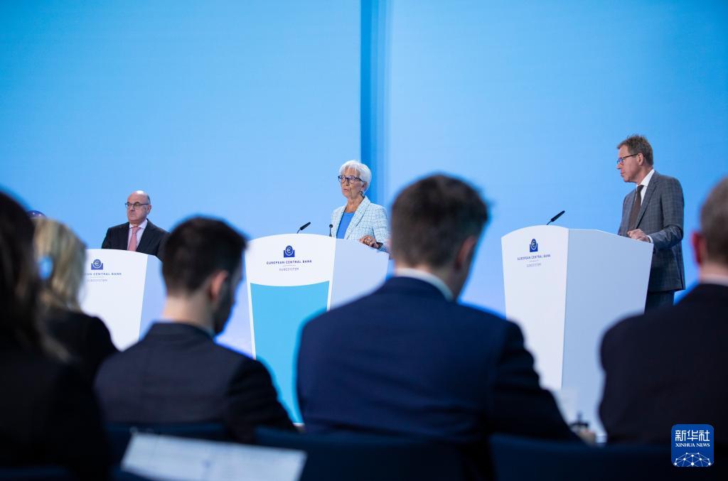 6月6日,歐洲中央銀行行長(zhǎng)拉加德(中)在德國(guó)法蘭克福歐洲中央銀行總部舉行的新聞發(fā)布會(huì)上講話。