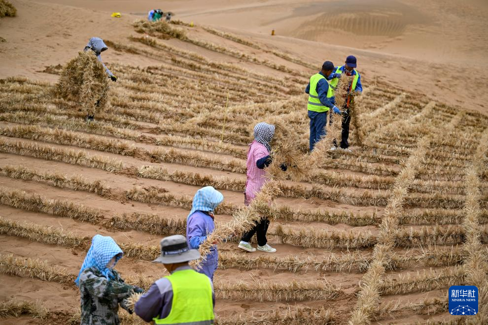 治沙工人在寧夏中衛(wèi)市境內(nèi)的騰格里沙漠鋪設(shè)刷狀網(wǎng)繩式草方格沙障(5月29日攝)。
