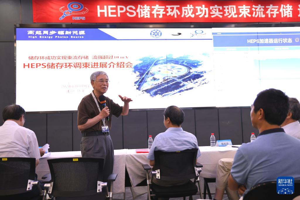 8月19日,在高能同步輻射光源中央控制室舉行的進展介紹會上,陳森玉院士在點評。新華社記者 金立旺 攝