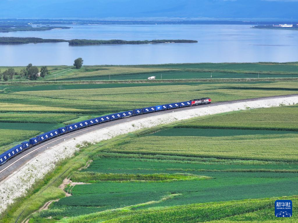 8月9日,一列裝載55箱的中歐班列駛出黑龍江同江北站(無人機(jī)照片)。新華社發(fā)(吳雨南攝)