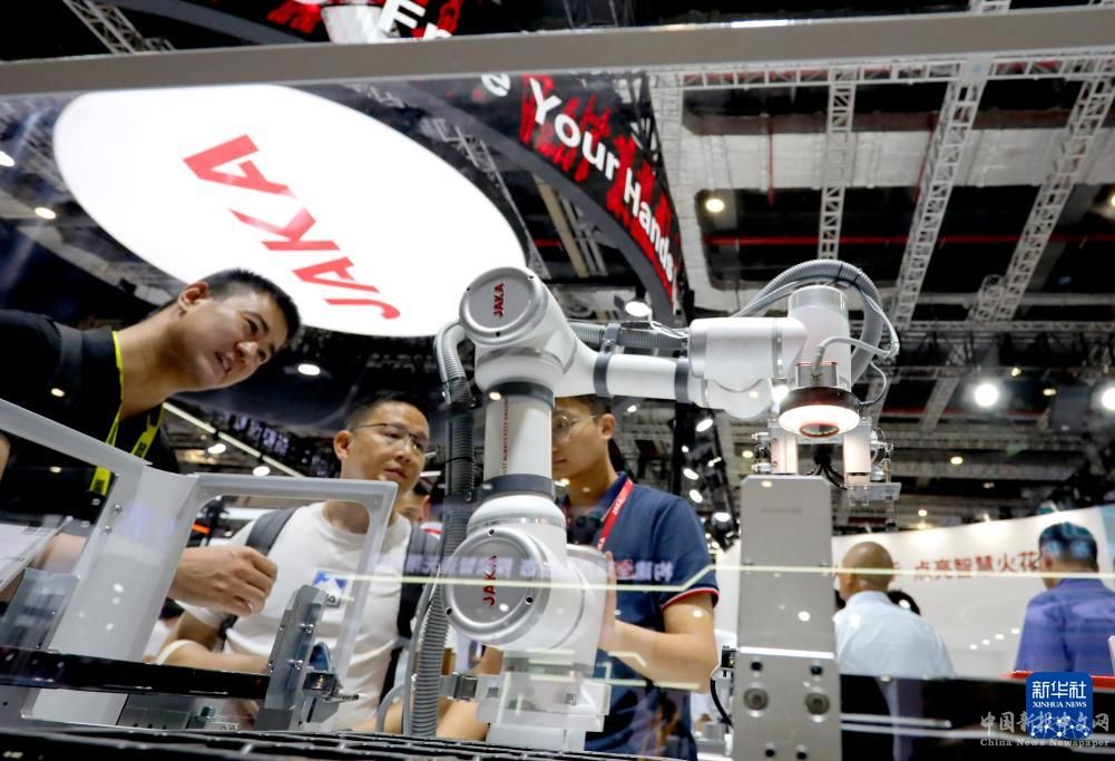 9月24日,參觀者在一個視覺引導(dǎo)上下料協(xié)作機(jī)器人旁駐足觀看。