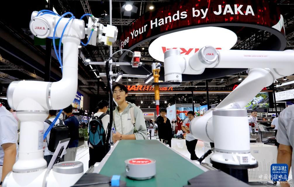9月24日,參觀者在一個進(jìn)行作業(yè)演示的在線跟隨抓取協(xié)作機(jī)器人前駐足觀看。