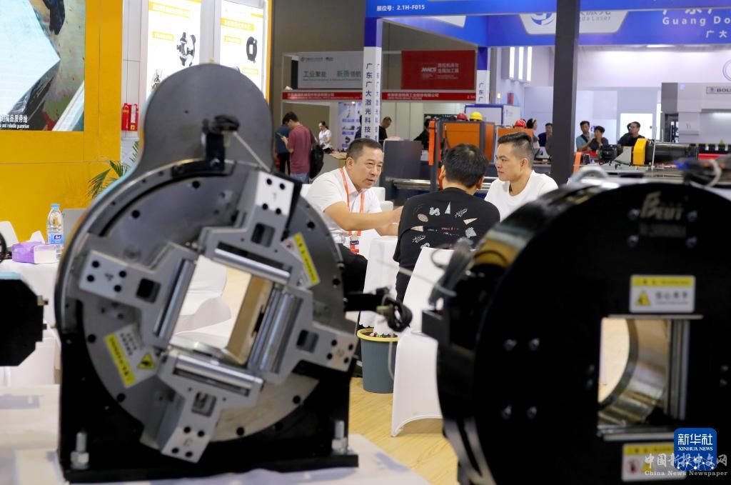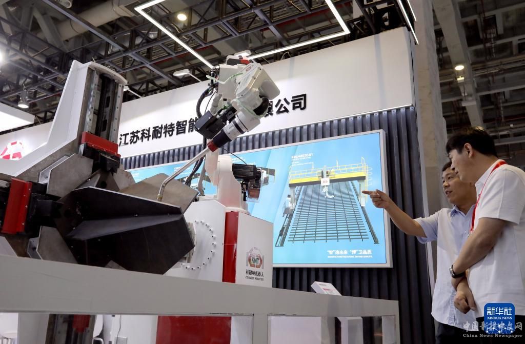 9月24日,參觀者在一個進(jìn)行作業(yè)演示的H型變位焊接工作站旁交流討論。