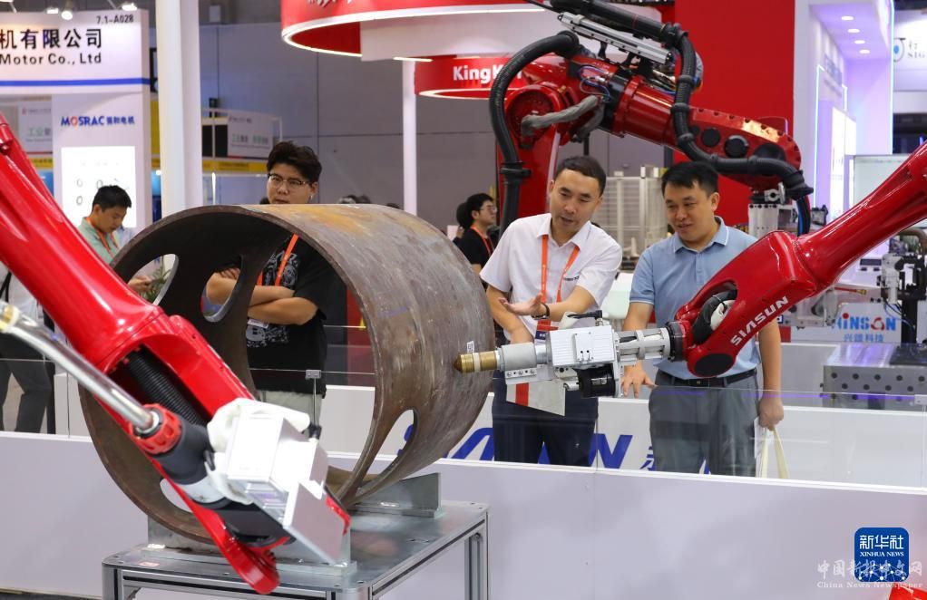 9月24日,工作人員向參觀者介紹一款磁弧焊自動化焊接系統(tǒng)。