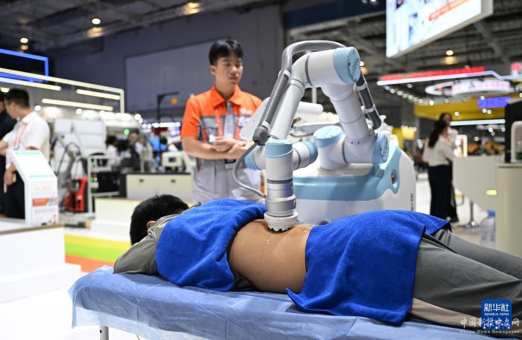 9月24日,一名參觀者在體驗推拿按摩機(jī)器人。