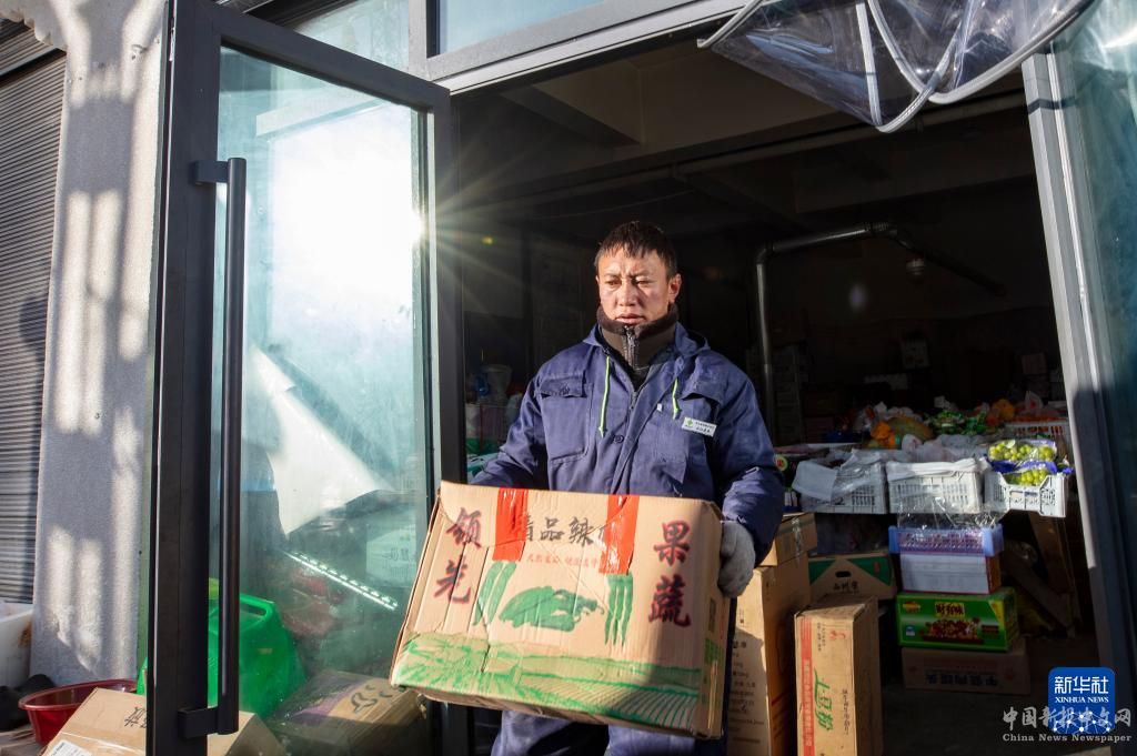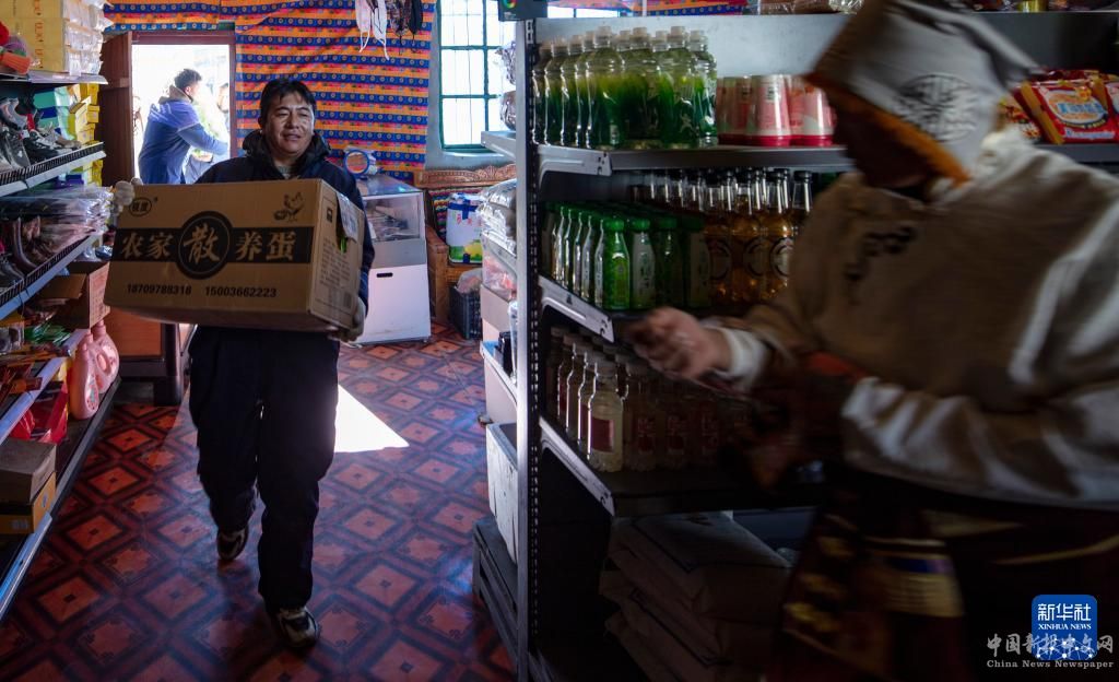 申扎縣供銷合作社的配送員次仁桑珠在縣城總店為馬躍鄉(xiāng)貝嘎四村偏遠(yuǎn)鄉(xiāng)鎮(zhèn)果蔬配送試點項目直銷點上貨(1月5日攝)。