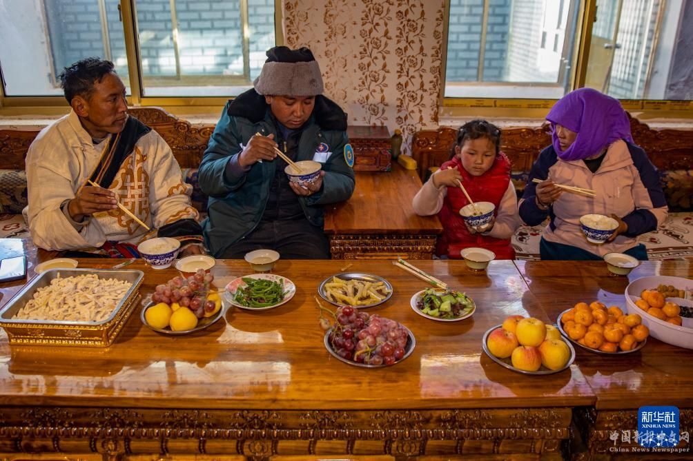 申扎縣馬躍鄉(xiāng)貝嘎四村村民次仁曲達(dá)(左一)家在吃飯,桌上的新鮮蔬菜和水果都是在村里的偏遠(yuǎn)鄉(xiāng)鎮(zhèn)果蔬配送試點項目直銷點采購的,由供銷合作社當(dāng)天配送而來(1月5日攝)。