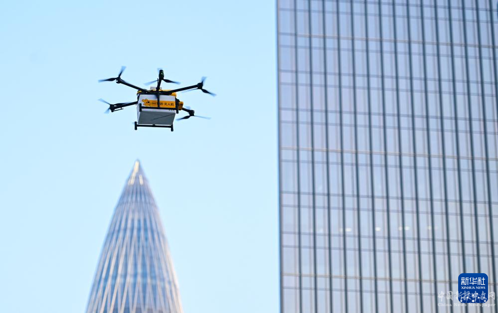 美團(tuán)送餐無(wú)人機(jī)穿行在深圳市后海片區(qū)的樓宇之間(2023年11月24日攝)。