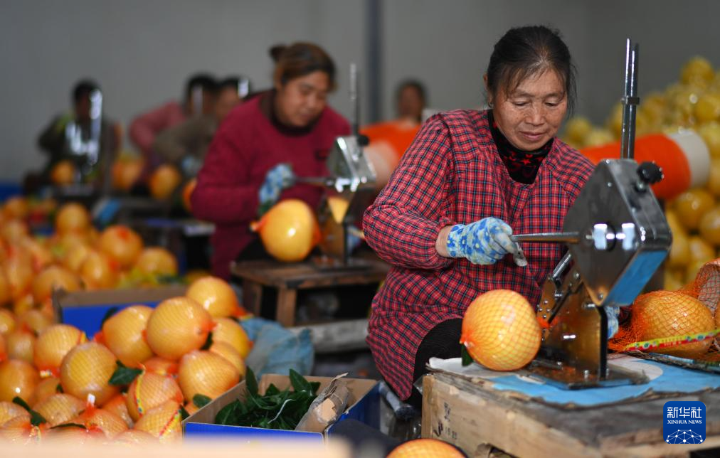 1月8日,在岑鞏縣注溪鎮(zhèn)周坪村果樹種植專業(yè)合作社,村民在包裝柚子。
