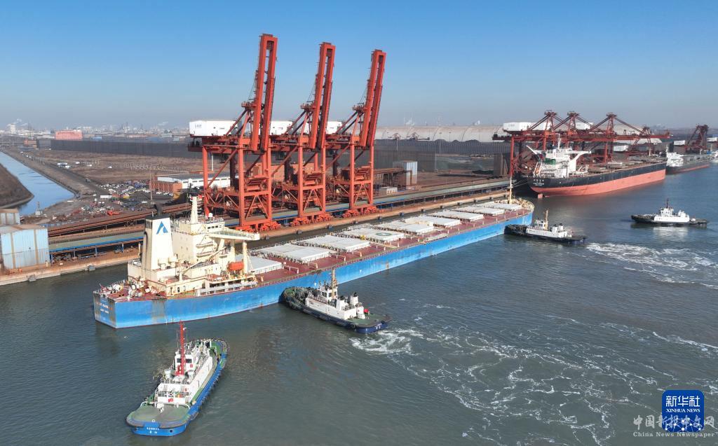 1月15日,一艘輪船在拖輪的協(xié)助下向唐山港京唐港區(qū)煤炭碼頭靠泊(無人機(jī)照片)。