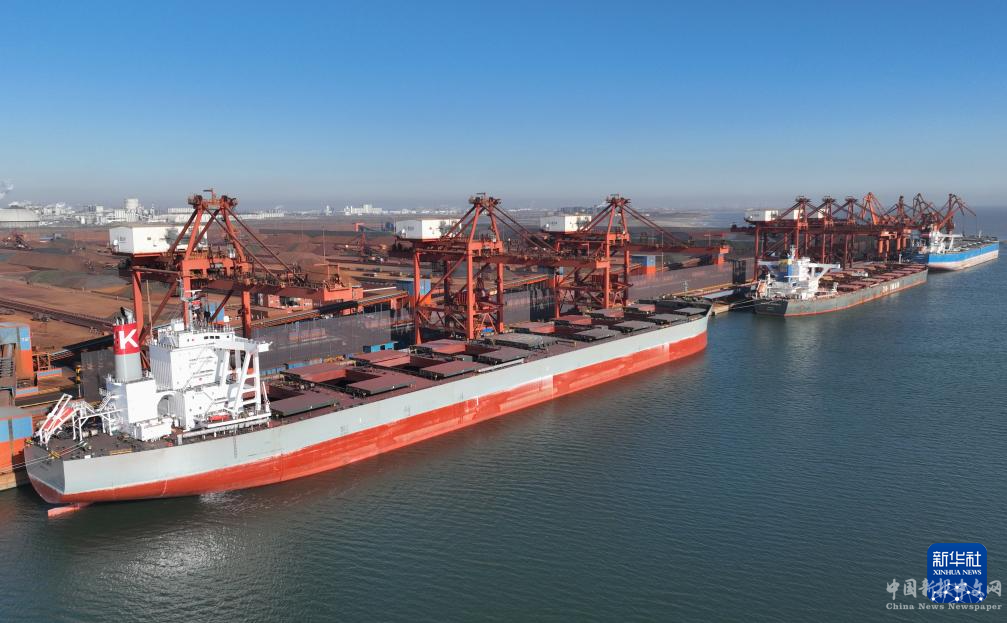 1月15日,三艘輪船靠泊在唐山港京唐港區(qū)礦石碼頭卸載貨物(無人機(jī)照片)。