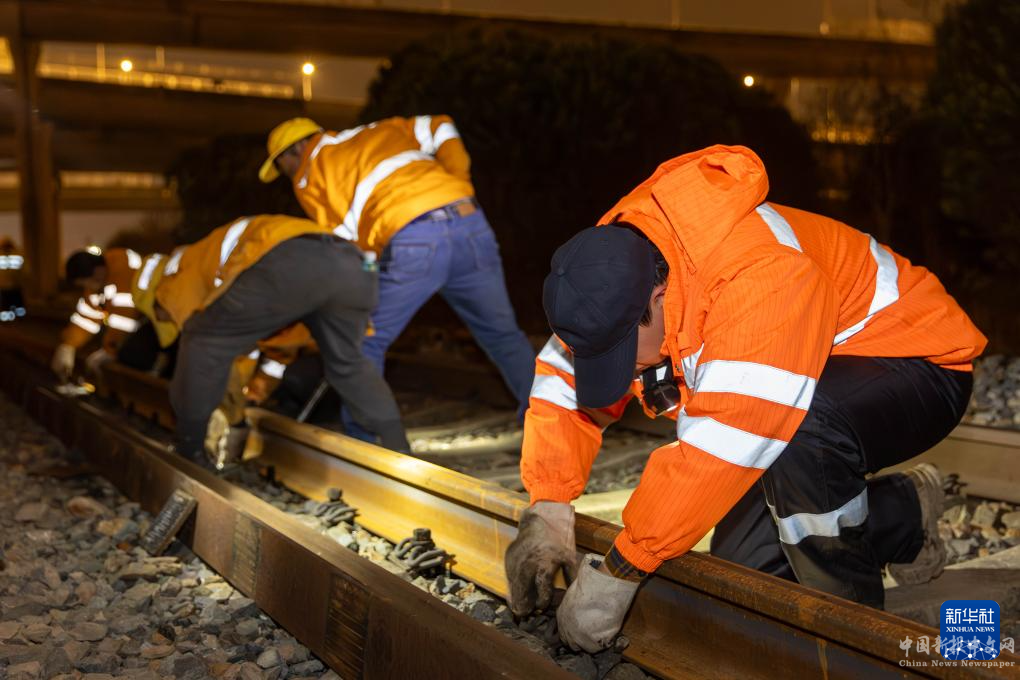 當(dāng)日凌晨,中國(guó)鐵路上海局集團(tuán)有限公司上海工務(wù)段工人對(duì)上海虹橋站站區(qū)共計(jì)500米長(zhǎng)的鐵路鋼軌進(jìn)行換軌施工,從切割舊軌、安裝新軌到新軌焊接打磨,各道工序有條不紊,為即將到來(lái)的春運(yùn)行車提供安全保障。