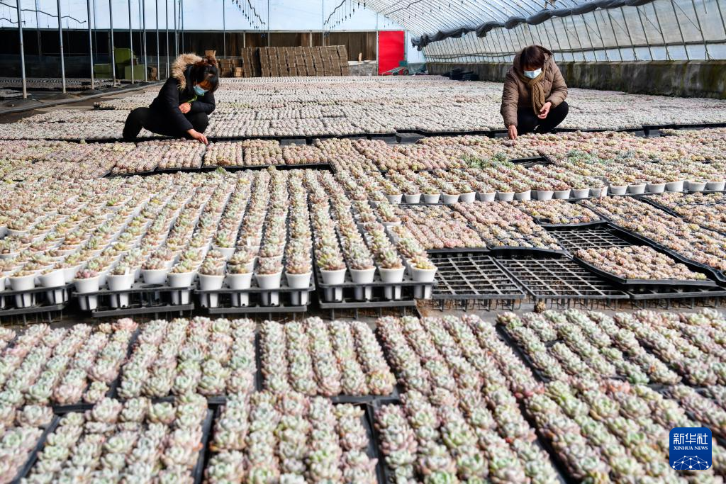 1月22日,村民在水泉村紫仟家庭農(nóng)場多肉植物大棚內(nèi)管理多肉植物。