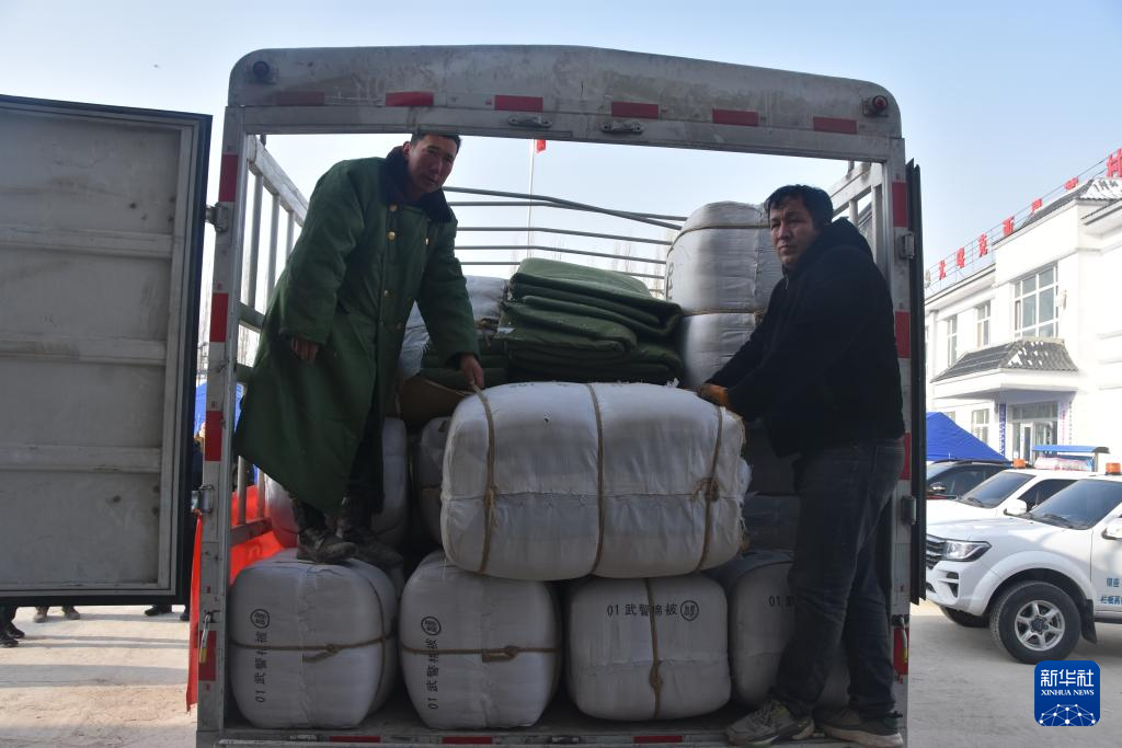 1月24日,在烏什縣一處安置點,志愿者在搬運物資。