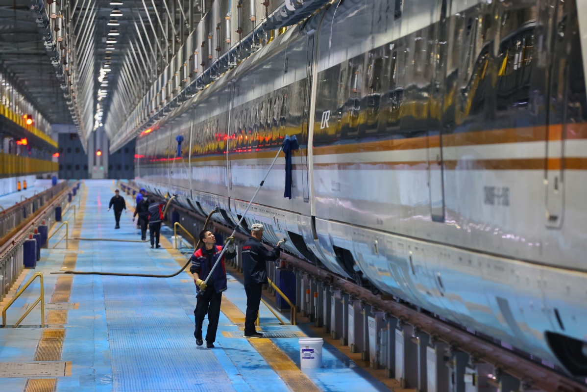 中國(guó)日?qǐng)?bào)北京1月25日電(記者 姜東)2024年1月25日晚,春運(yùn)前夕,在北京動(dòng)車段朝陽(yáng)動(dòng)車運(yùn)用所,檢修人員對(duì)即將參與2024年春運(yùn)的動(dòng)車組列車進(jìn)行全方面檢查,確保春運(yùn)安全。