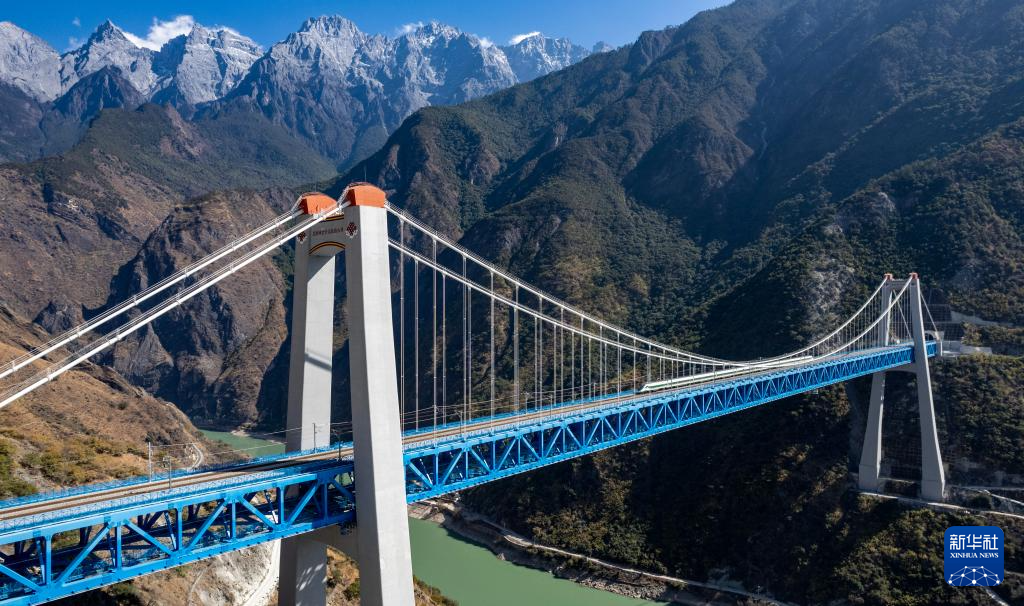 1月24日,列車通過虎跳峽金沙江鐵路大橋,遠(yuǎn)處是玉龍雪山(無人機(jī)照片)。