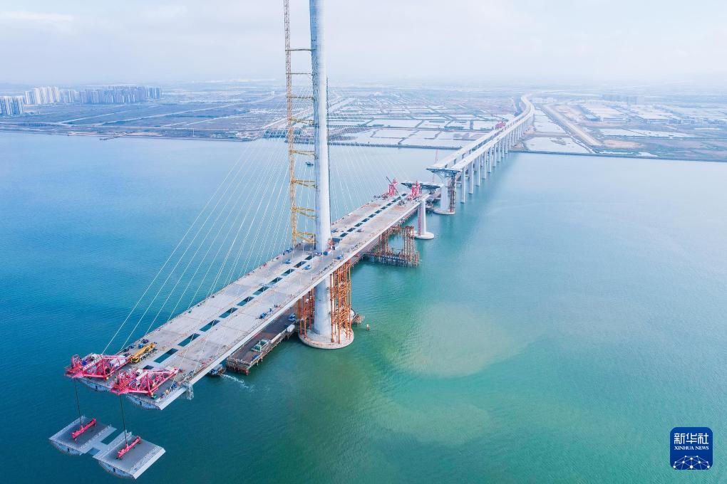 中交路建承建的黃茅??绾Mǖ栏邫诟鄞髽驏|側(cè)進(jìn)行鋼箱梁吊裝(1月5日攝,無人機(jī)照片)。黃茅海跨海通道是粵港澳大灣區(qū)又一超大型跨海工程,連接珠海和江門兩市,全長約31公里。