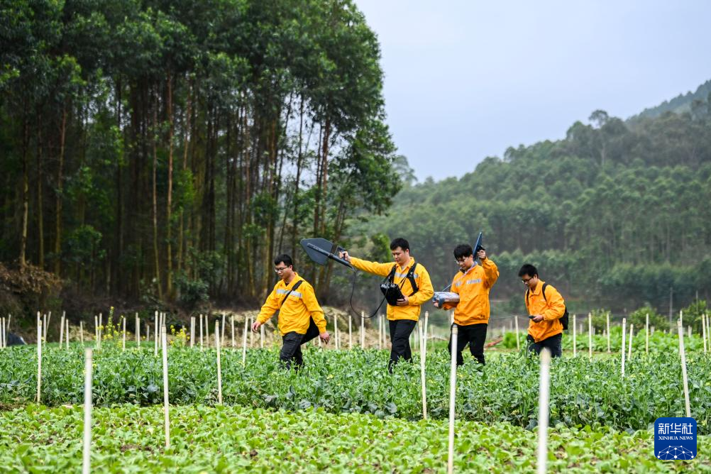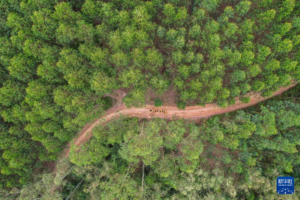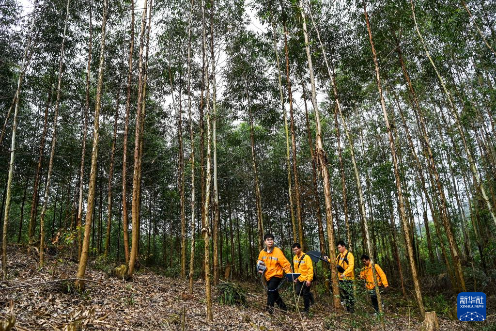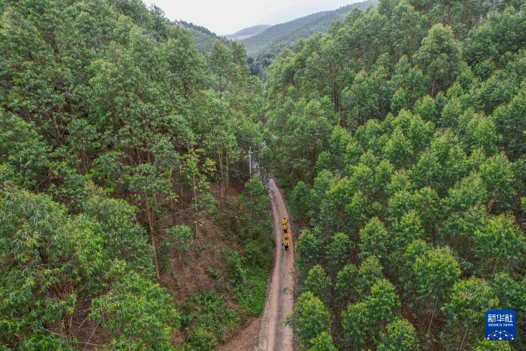 2月1日,中國鐵路南寧局集團有限公司南寧通信段“捕風者”在山林中搜尋信號干擾源(無人機照片)。