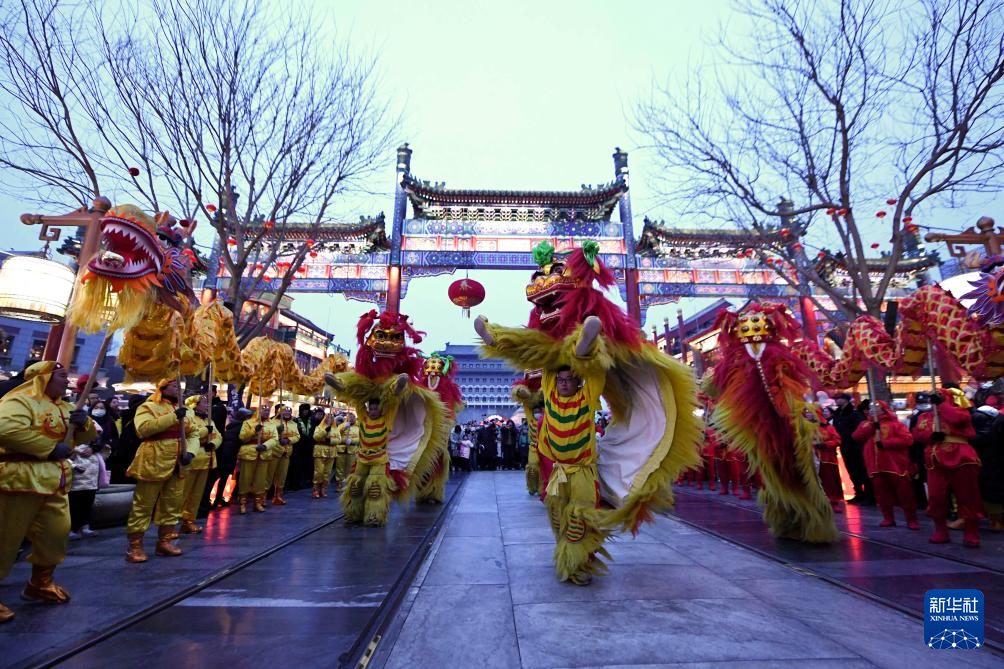 2月2日,演員在北京前門大街進(jìn)行舞龍舞獅表演。