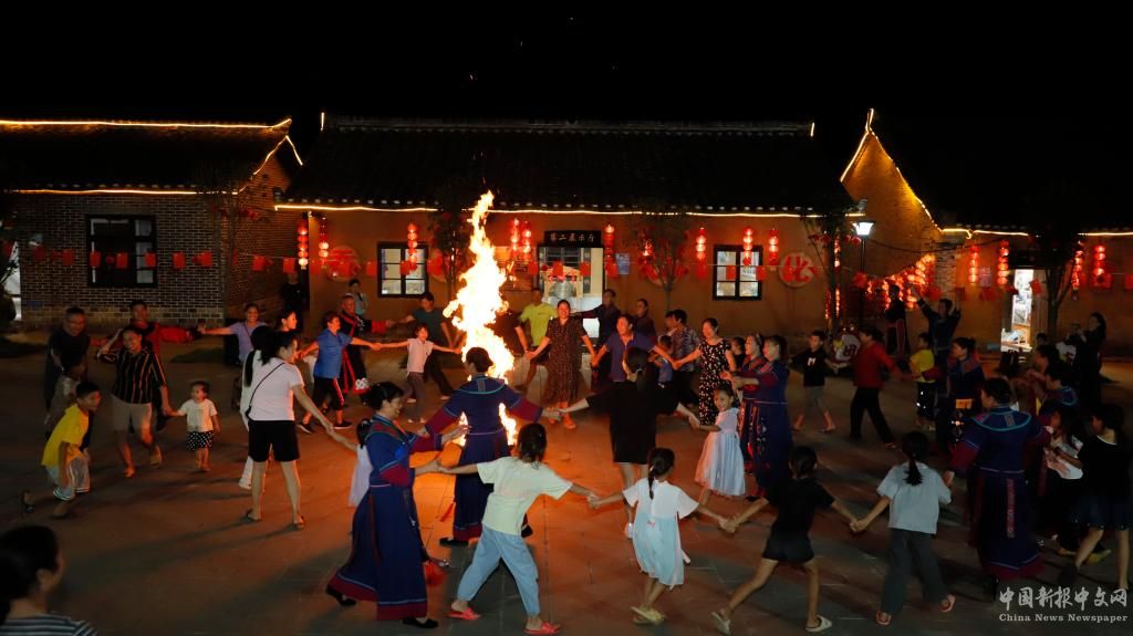 在廣西河池市環(huán)江毛南族自治縣大才鄉(xiāng)新坡村,游客在村里參與篝火晚會。(葉鵬攝)
