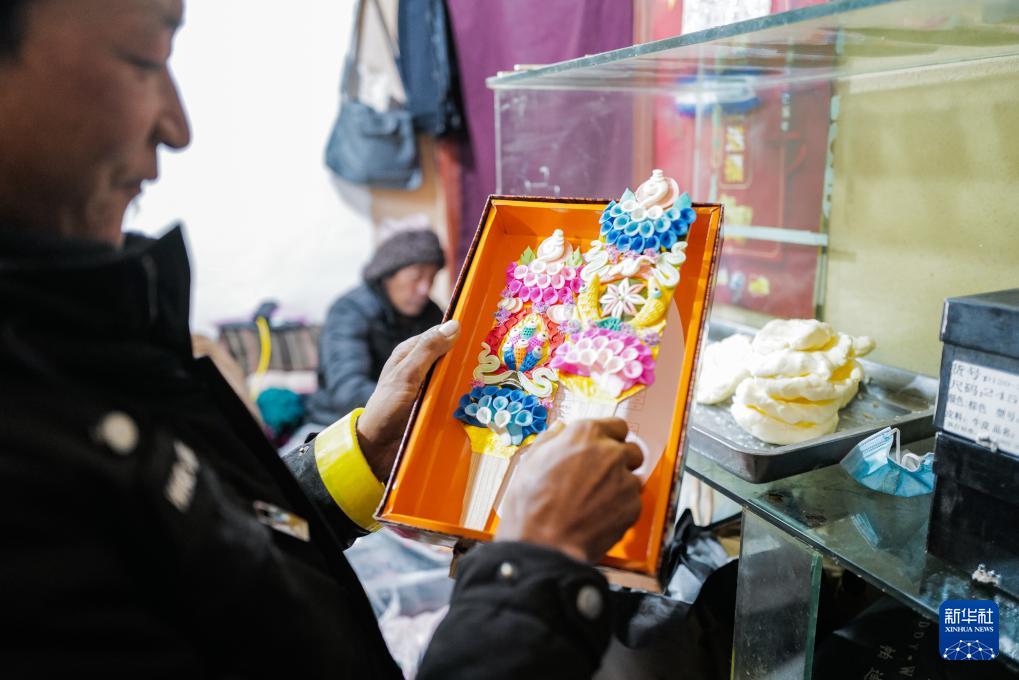 在拉薩八廓商城,制作完成的酥油花被放進盒中存放(2月7日攝)。
