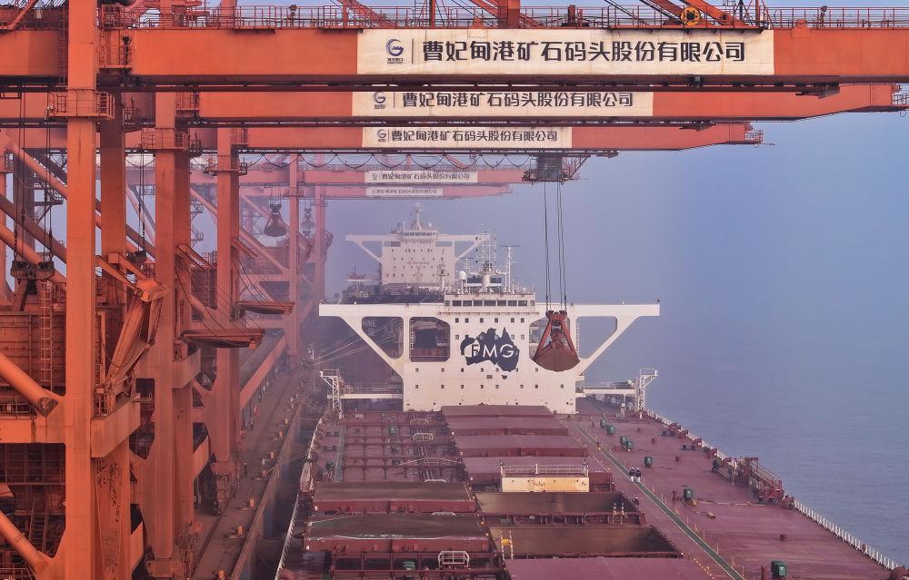 2024年2月7日,一艘輪船靠泊在唐山港曹妃甸港區(qū)礦石碼頭卸載(無(wú)人機(jī)照片)。新華社記者 楊世堯 攝