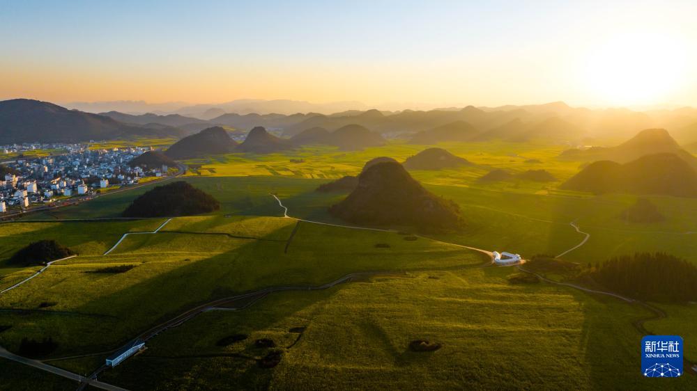 云南省羅平縣金雞峰叢油菜花海日出美景(2月19日攝,無(wú)人機(jī)照片)。