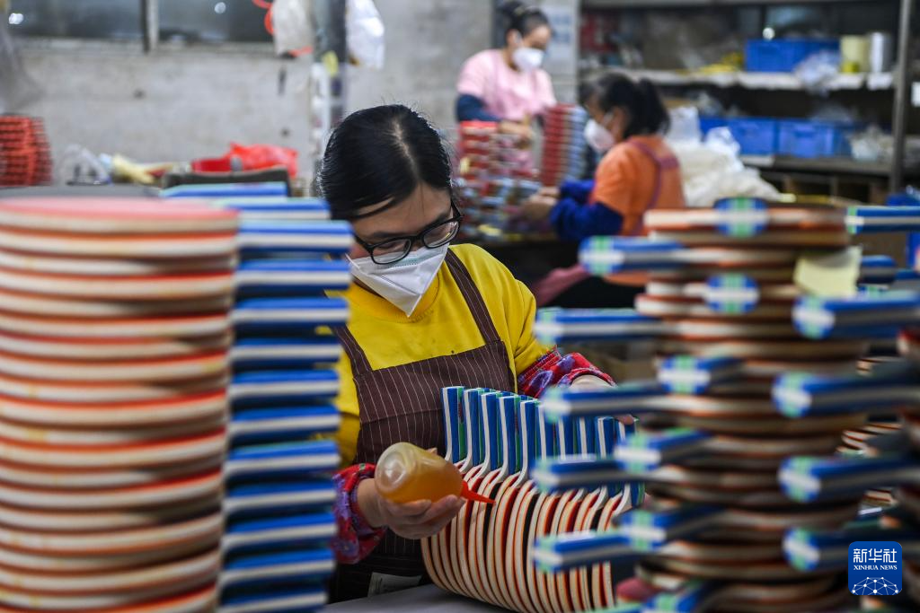 2月20日,在興業(yè)縣一家出口型企業(yè),工人生產(chǎn)乒乓球拍。