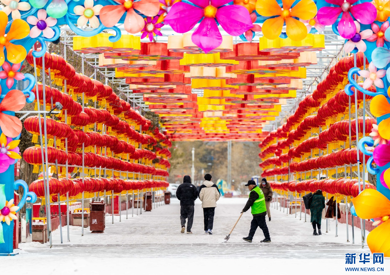 2月20日,環(huán)衛(wèi)工人在呼和浩特市玉泉區(qū)塞上老街旅游休閑街區(qū)燈籠長廊內(nèi)清除積雪。新華網(wǎng)發(fā)(丁根厚 攝)