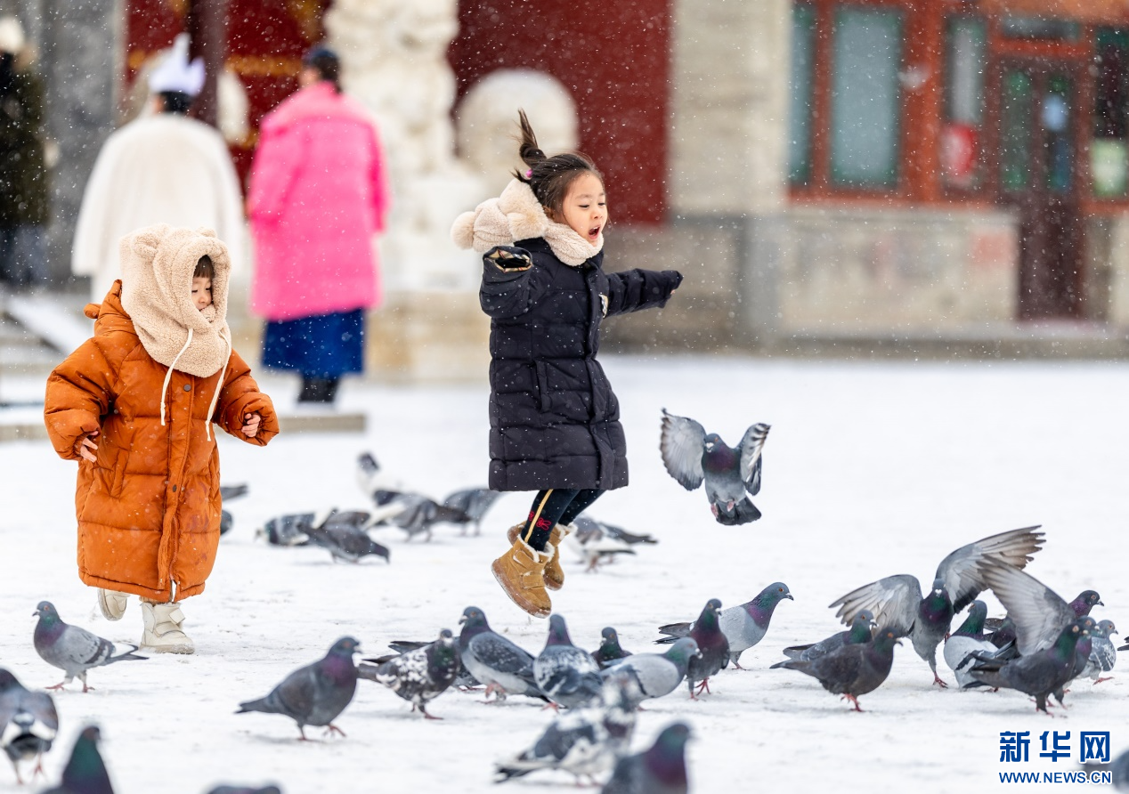 2月20日,小朋友在呼和浩特市玉泉區(qū)塞上老街旅游休閑街區(qū)與鴿子嬉戲。新華網(wǎng)發(fā)(丁根厚 攝)