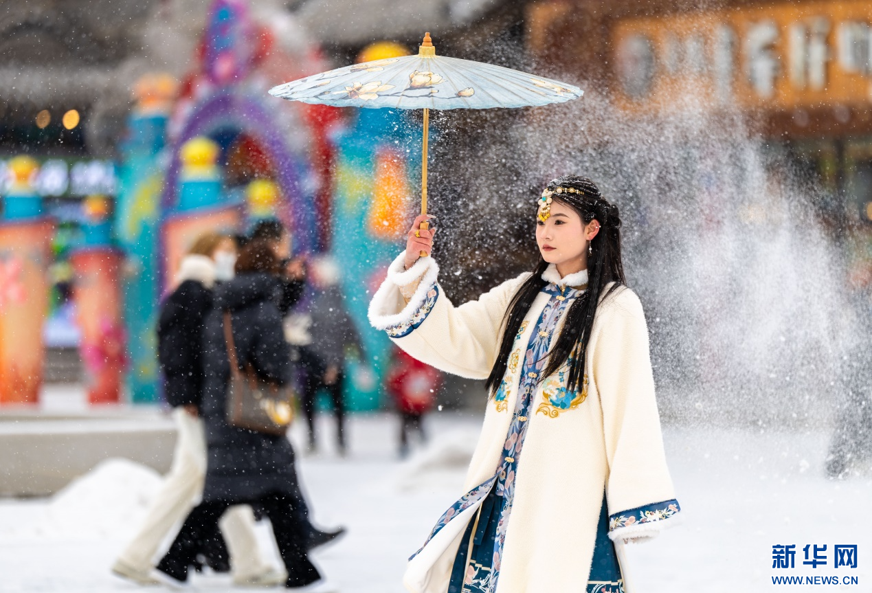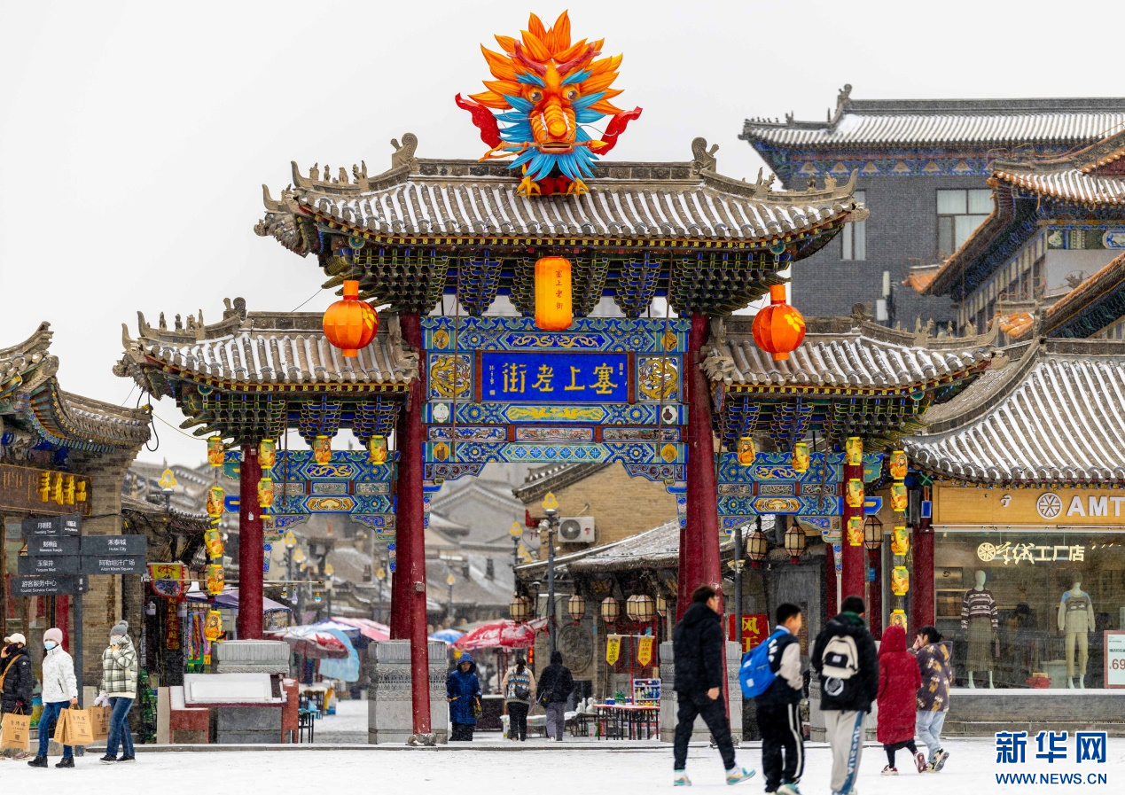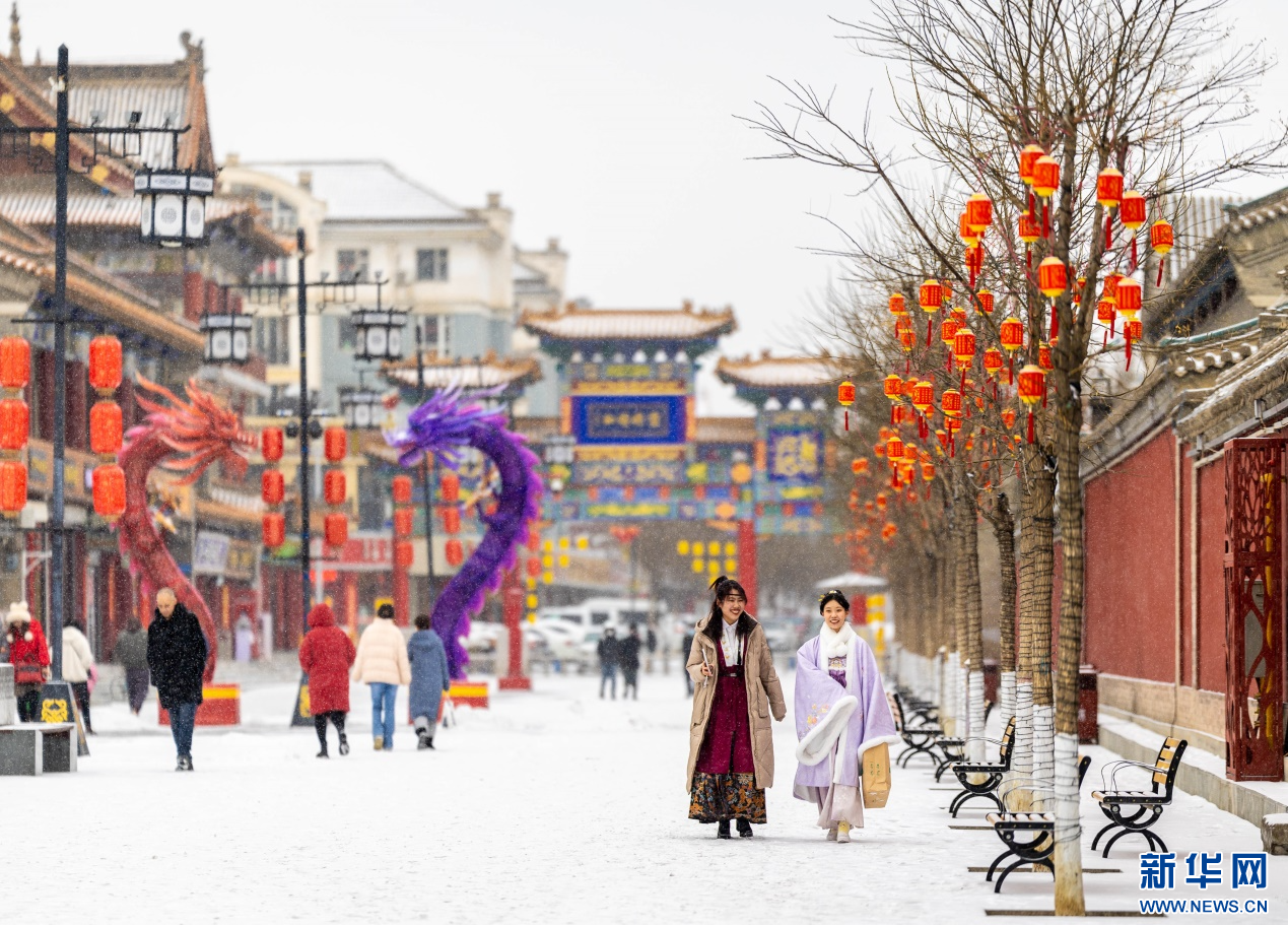2月20日,人們在呼和浩特市玉泉區(qū)塞上老街旅游休閑街區(qū)冒雪游玩。新華網(wǎng)發(fā)(丁根厚 攝)