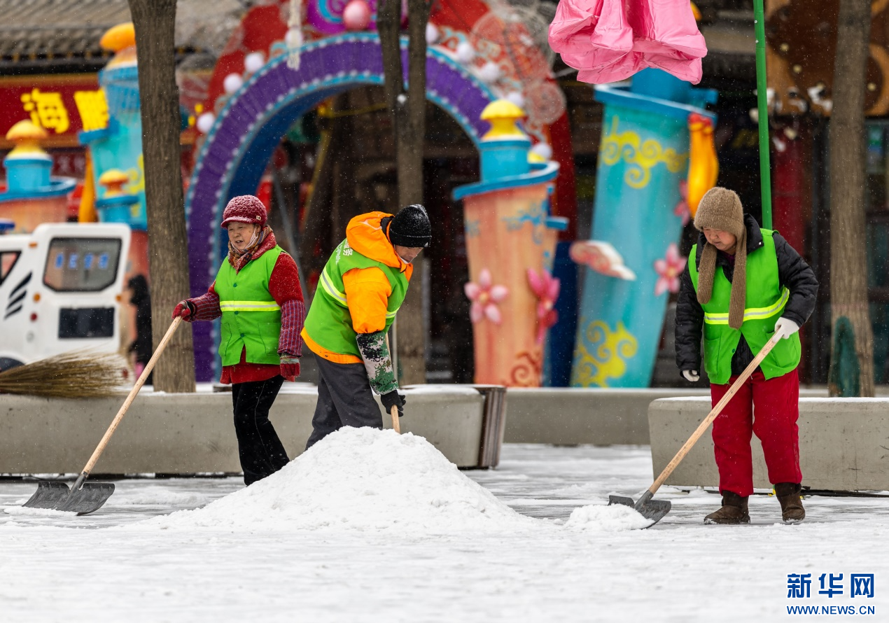 2月20日,環(huán)衛(wèi)工人在呼和浩特市玉泉區(qū)塞上老街旅游休閑街區(qū)廣場清除積雪。新華網(wǎng)發(fā)(丁根厚 攝)