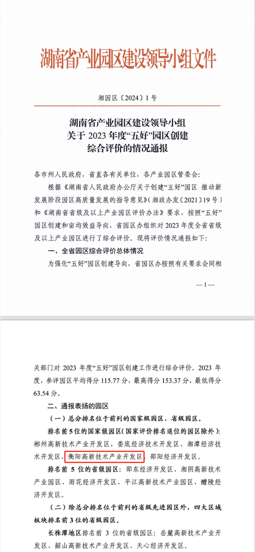 中國(guó)新報(bào)湖南訊 (通訊員 鄧小山 劉翔 記者 符秋祖)龍年伊始,湖南省產(chǎn)業(yè)園區(qū)建設(shè)領(lǐng)導(dǎo)小組辦公室通報(bào)2023年度全省“五好”園區(qū)創(chuàng)建綜合評(píng)價(jià)情況,衡陽(yáng)各園區(qū)排名大幅躍升,其中衡陽(yáng)高新區(qū)首次挺進(jìn)全省十強(qiáng)。