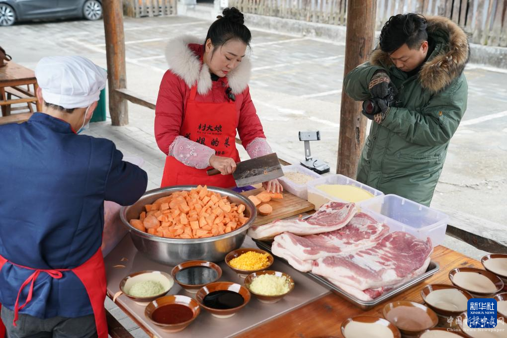 2月21日,在安康市漢濱區(qū),李花(中)在她的農(nóng)家樂院內(nèi),制作準(zhǔn)備用于網(wǎng)絡(luò)銷售的蒸碗,并拍攝短視頻。李花和丈夫從經(jīng)營農(nóng)家樂起步,后通過短視頻和直播等方式,在陜西省安康市漢濱區(qū)幫助農(nóng)戶銷售各類農(nóng)產(chǎn)品,并在當(dāng)?shù)爻闪?家農(nóng)業(yè)專業(yè)合作社服務(wù)農(nóng)民。