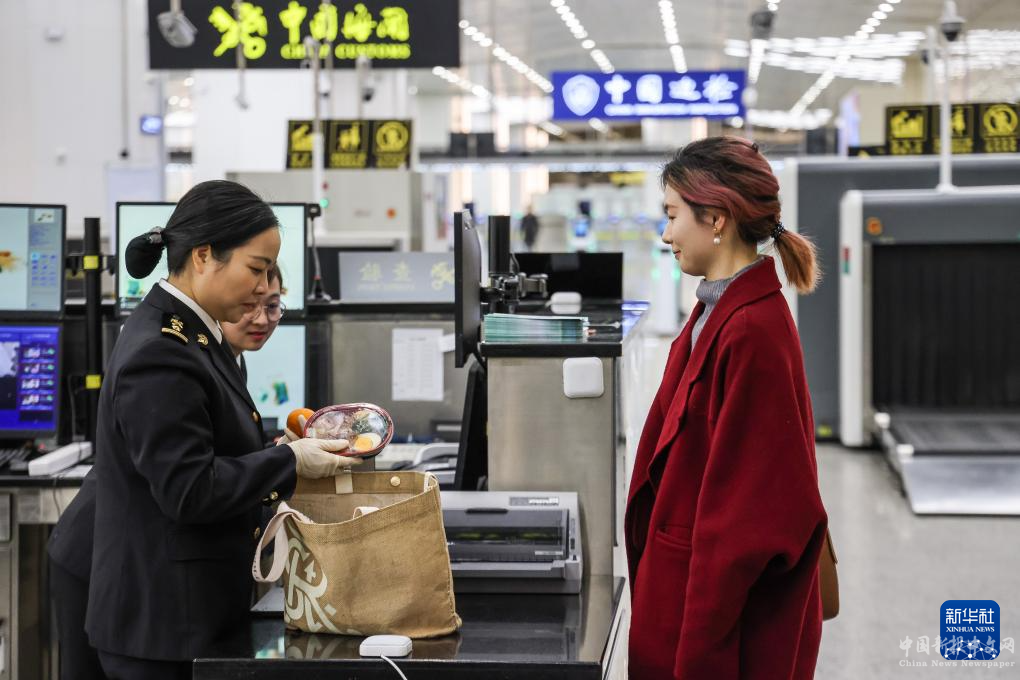 3月1日,橫琴口岸海關工作人員對澳門市民程曦(右)的行李進行查驗。程曦是橫琴粵澳深度合作區(qū)正式封關運行后首位通關的旅客。