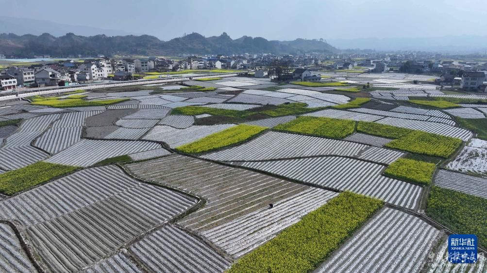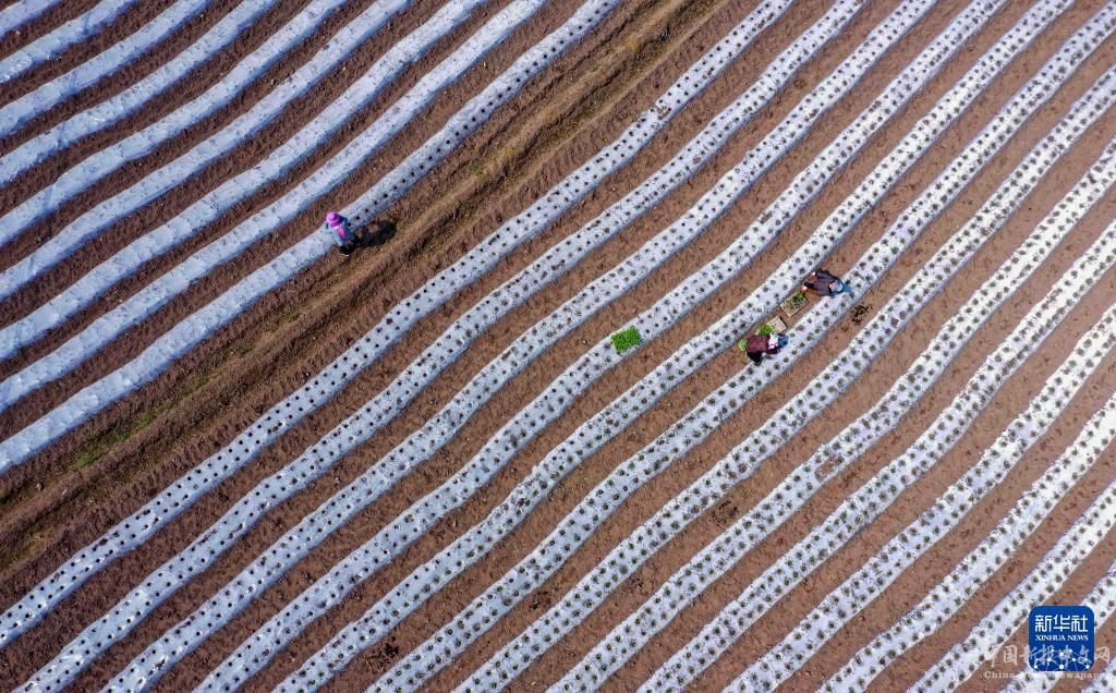 3月9日,村民在貴州省黔東南苗族侗族自治州黃平縣舊州鎮(zhèn)白紙橋村田間管護(hù)蔬菜苗(無(wú)人機(jī)照片)。