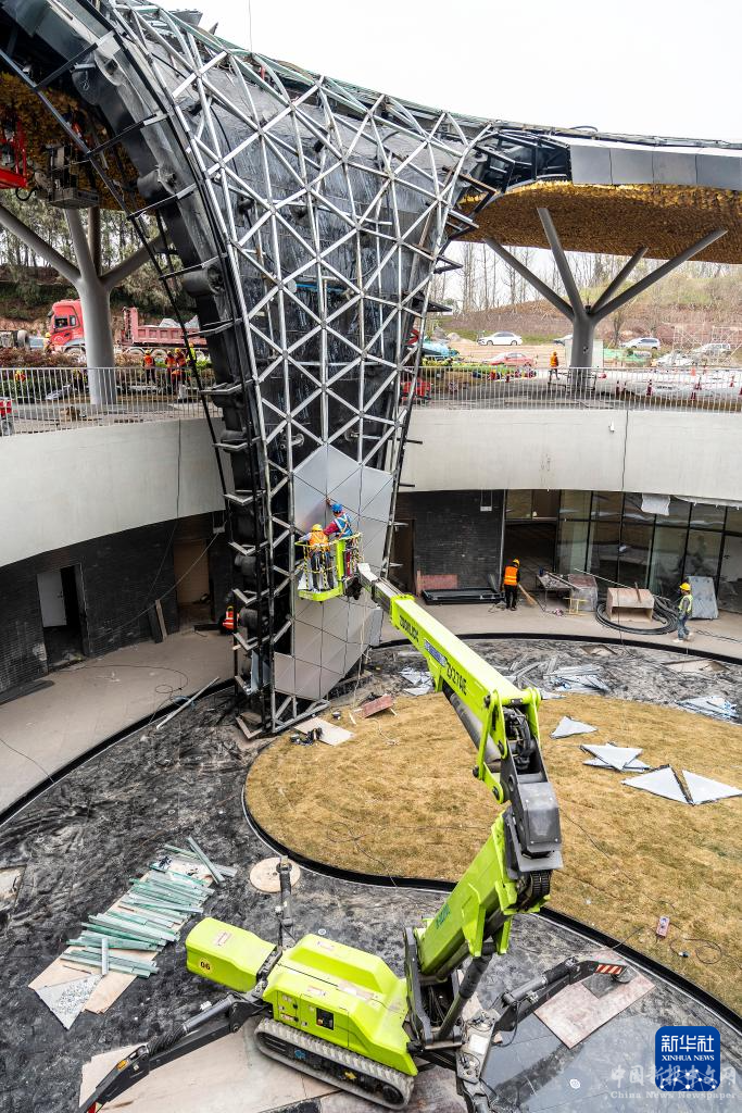 3月8日,項(xiàng)目施工方中建八局的建設(shè)人員在安裝世園會(huì)主展館下沉云臺(tái)瀑布鋁板。