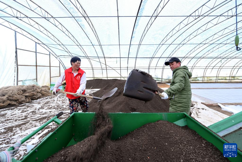 3月15日,在黑龍江北大荒農(nóng)業(yè)股份有限公司友誼分公司第五管理區(qū)的育秧大棚里,職工在進行水稻育秧前的擺盤覆土作業(yè)。