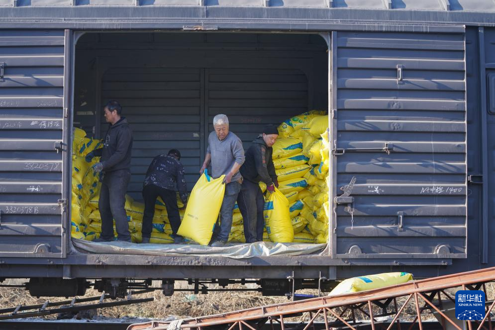 3月14日,在黑龍江北大荒農(nóng)業(yè)股份有限公司友誼分公司農(nóng)資鐵路專運線,工人在卸運化肥。