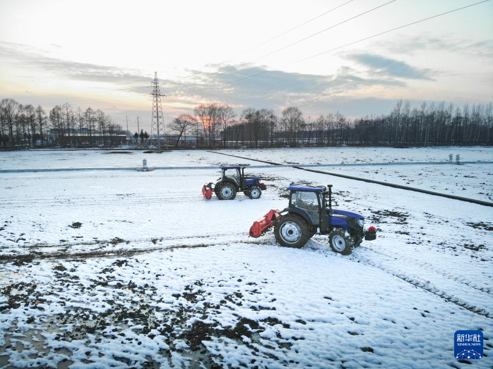 3月14日,在黑龍江北大荒農(nóng)業(yè)股份有限公司友誼分公司第四管理區(qū)的地塊內(nèi),一輛大馬力拖拉機對耕地進行耙雪除冰作業(yè)(無人機照片)。