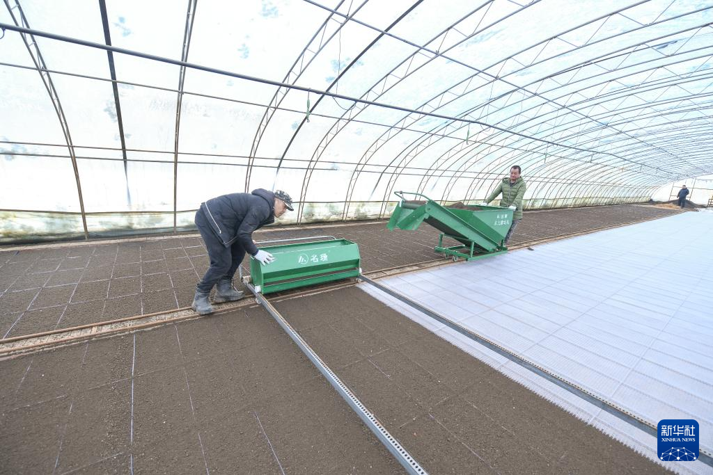 3月15日,在黑龍江北大荒農(nóng)業(yè)股份有限公司友誼分公司第五管理區(qū)的育秧大棚里,農(nóng)業(yè)職工在進行水稻育秧前的擺盤覆土作業(yè)。